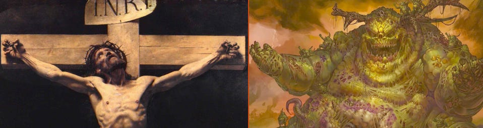 But to my eyes The closest Humanity has ever come to worshiping Nurgle the Demon God of Pesitilence, is Jesus Christ meek and mild.
