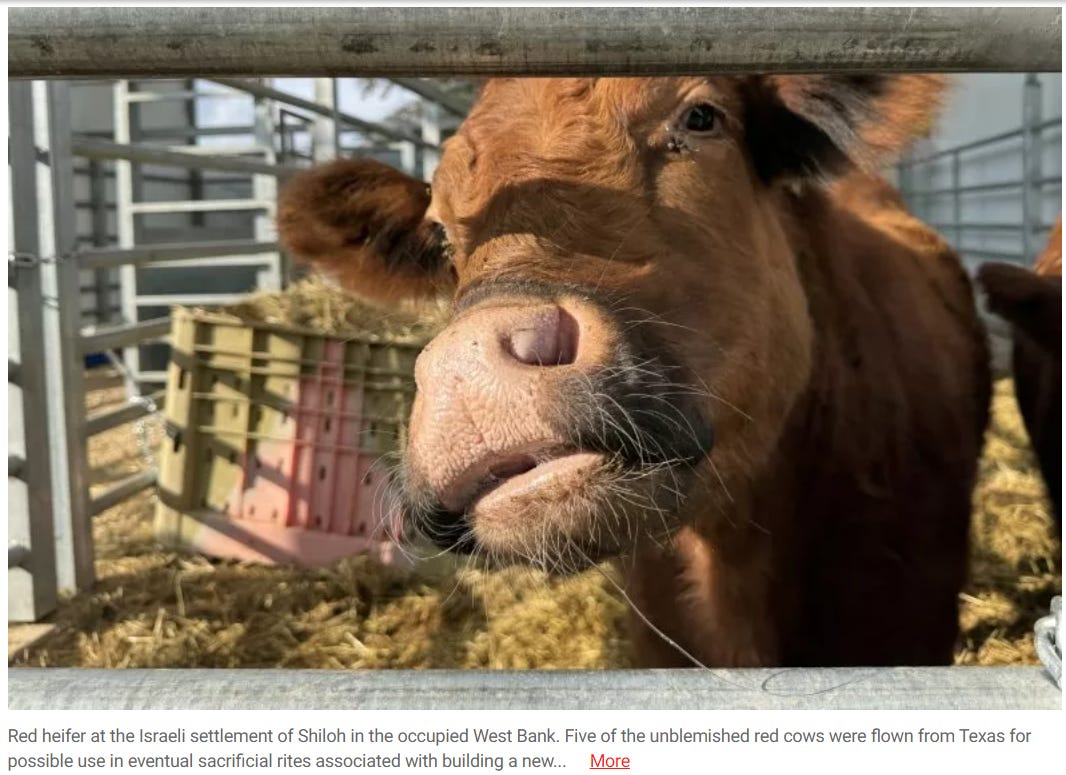 The next prophesy after the red Heifer sacrifice is the destruction of the Al-Aqsa Mosque, the third holiest site in islam (and the one Oct 7th’s “Operation Al-Aqsa Flood” was named for) bet that if the sacrifice happens radical Jewish arsonists will destroy the mosque (with tacit Israeli state backing)'