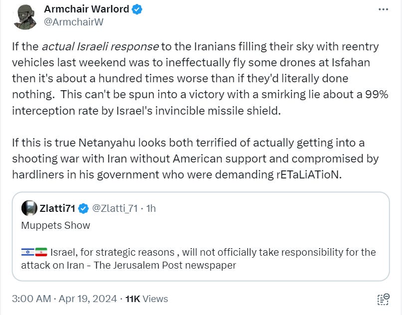 I’d discounted the possibility entirely because Israel’s entire regional strategy depends on maintaining EXTREME disproportionate power balances… Like viciously aggressive small dogs, their entire regional strategy depends on the threat of disproportionate response to cow tons of regional enemies into a state of fear…
