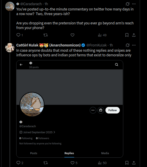 Again I’m very convinced that the wider demoralization posting is almost all astroturfed and botted, with maybe 1 AI, or Indian, or Quebecois (There are so many call centers in Quebec— lowest minimum wage denominated in Canadian dollars) to 1000 bots working on the back-end to try and cover if the bots get into trouble, or a conversation goes 4-5 replies deep.
