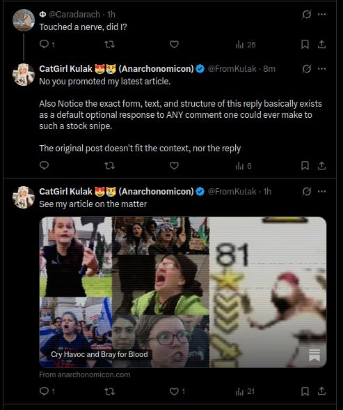 That might be true, that might even be devastating if you could get Fuentes to believe it and actually stop… But if you believed it, then how little do you matter that you’re a negative-Nancy with 5 followers going after a Moderate with a million followers who himself doesn’t matter? What’s 00.0005% of Nothing?