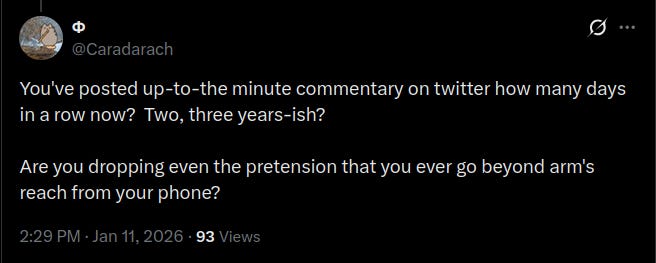 What type of person goes up to a 67k follower account, with dozens of podcast appearances, a large blog/website, someone successfully living off their poasting and writing… A professional commentator/philosopher with the following to show it… and Says “you’re on your phone a lot” in the most passive aggressive manner that almost certainly won’t get a response?