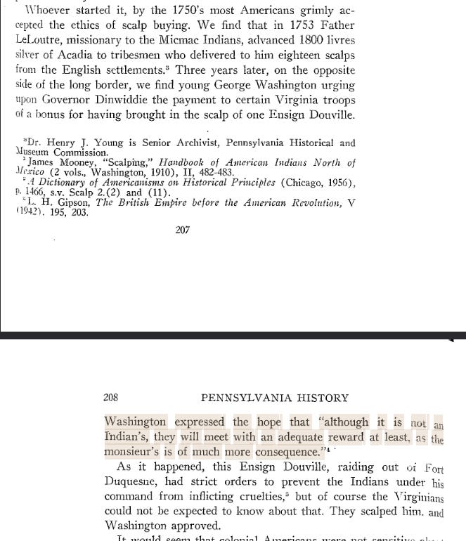 We even have the letters the young George Washington wrote his superiors for special permission to pay his soldiers for scalping white men.